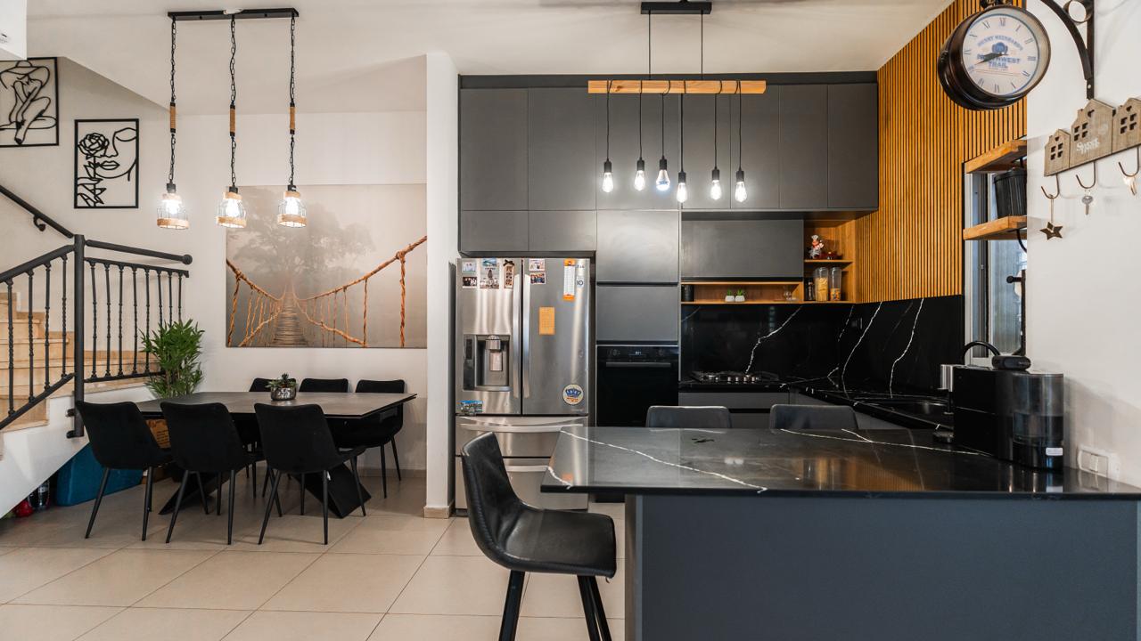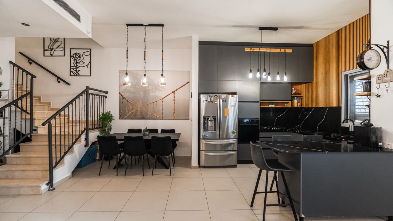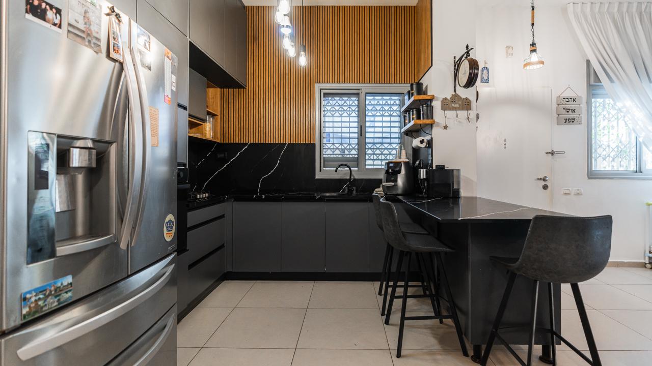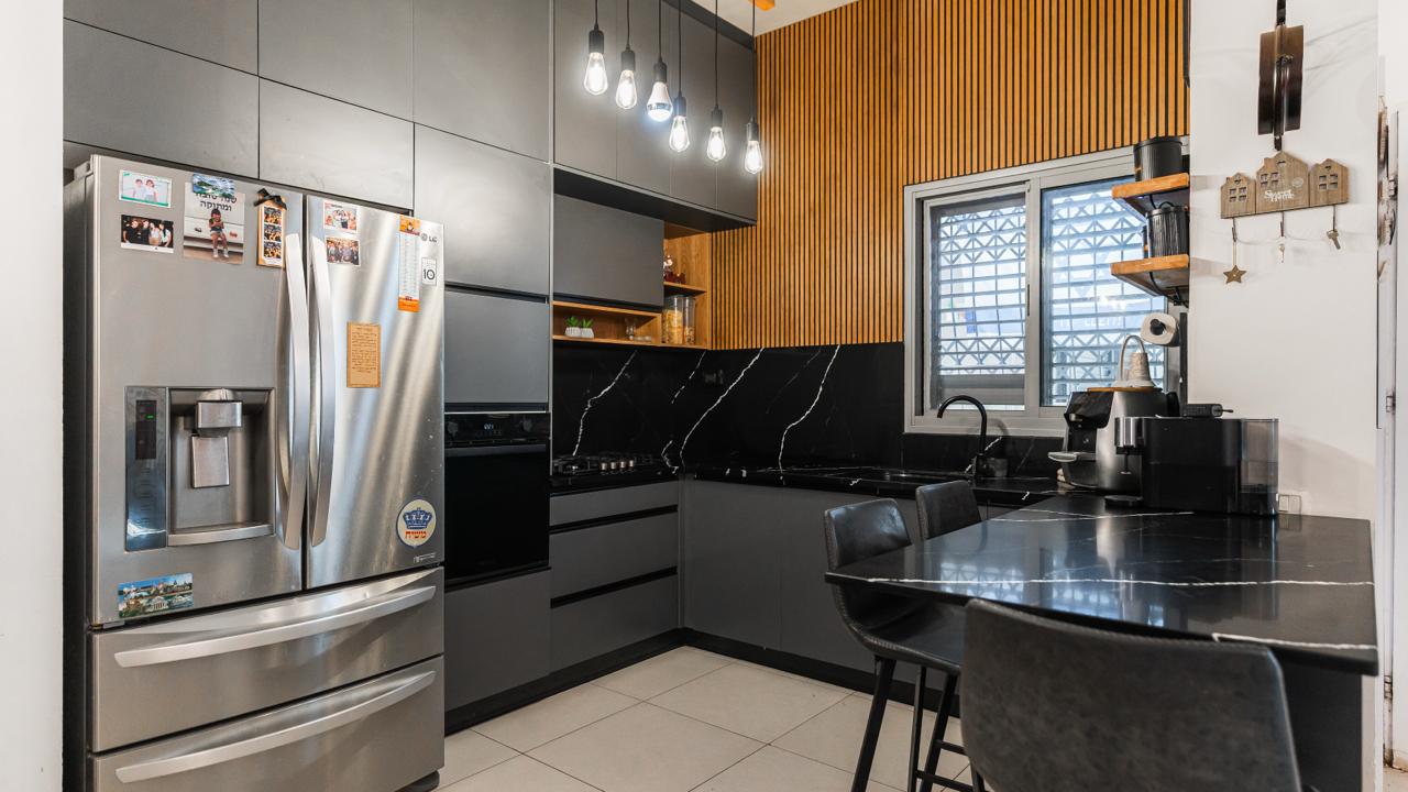 מטבח מנגר פרטי עם חיפוי עץ וארונות עד התקרה